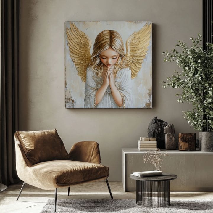 Anđeli se od pamtivijeka smatraju zaštitnicima i glasnicima mira. U povijesti umjetnosti često su prikazivani kao nježna i miroljubiva bića koja donose nadu i duhovni sklad. Na renesansnim slikama anđeli su služili kao simbol božanske prisutnosti, a zlatni elementi na tim djelima naglašavali su njihovu onostranu prirodu. Današnji moderni tretmani slika anđela spajaju ove tradicionalne vrijednosti sa suvremenim umjetničkim pristupom, stvarajući djela koja odjekuju u suvremenim interijerima.