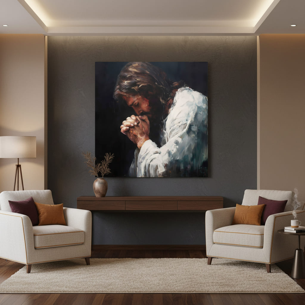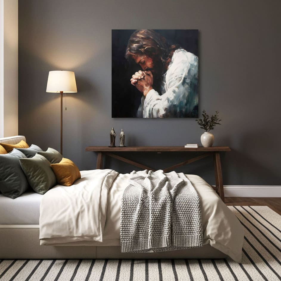 Spavaća soba A: Slike s mirnim i mekim tonovima, poput Krista s mirnim izrazom, idealne su za spavaću sobu, gdje će sobi dati atmosferu mira i privatnosti.
